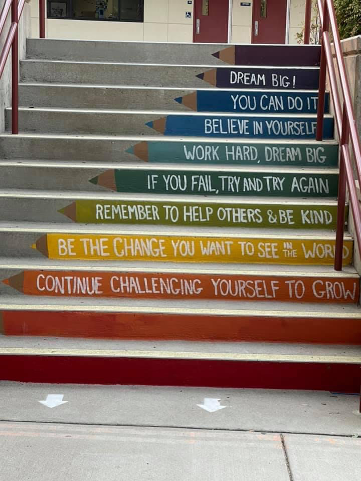After painting these stair murals, students and staff have commented about how much pride they feel for their school. Not only do these murals add beauty to the campus, they also reflect core values that the school wants to impart on students and staff alike.